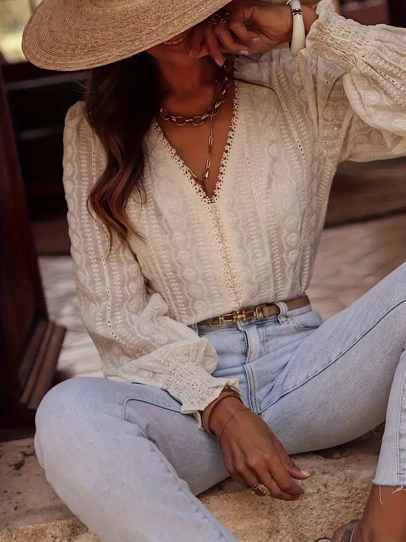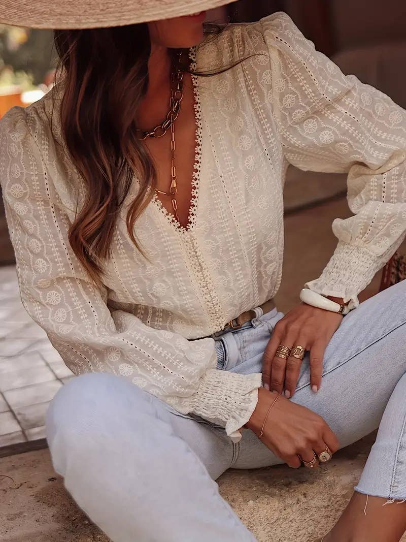French chill Ecru Floral Embroidered blouse V-neck top