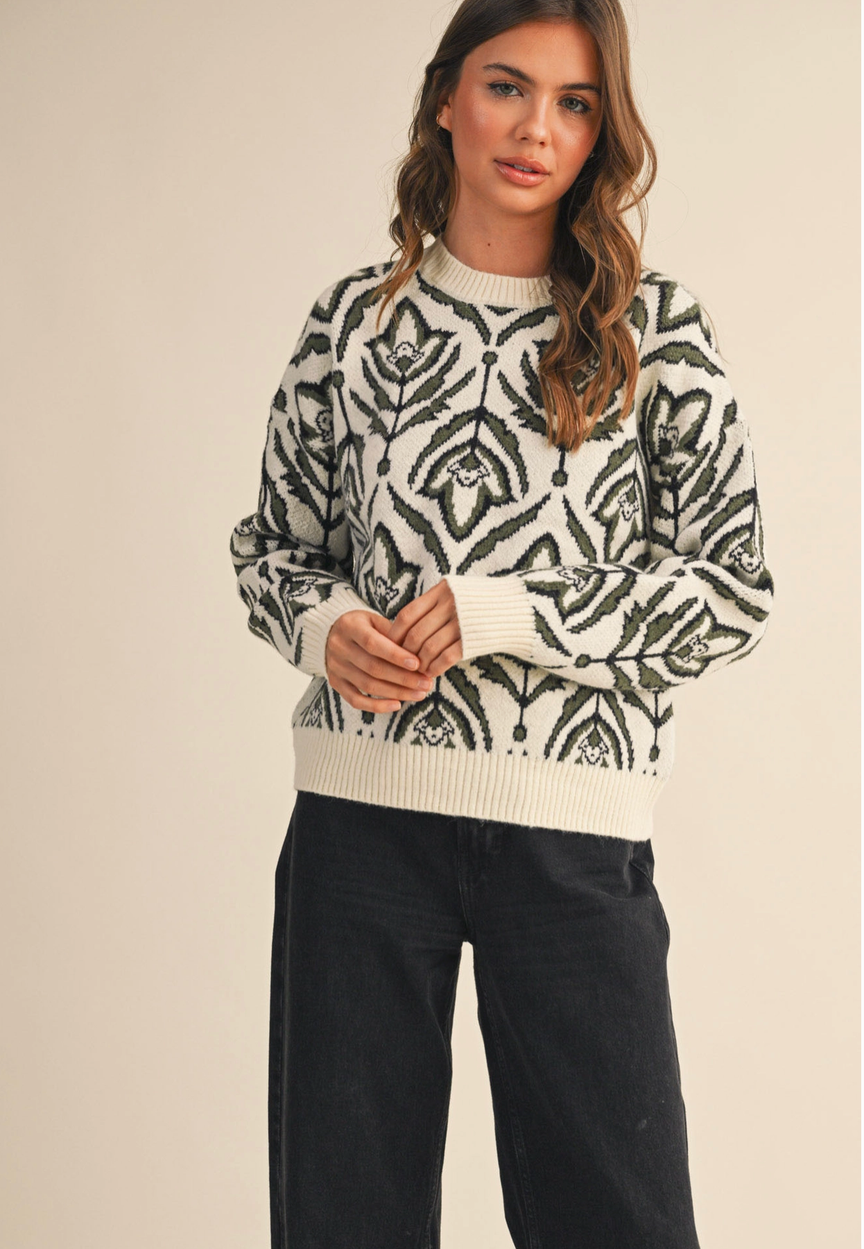 Olive Green Floral Pattern Knit Sweater