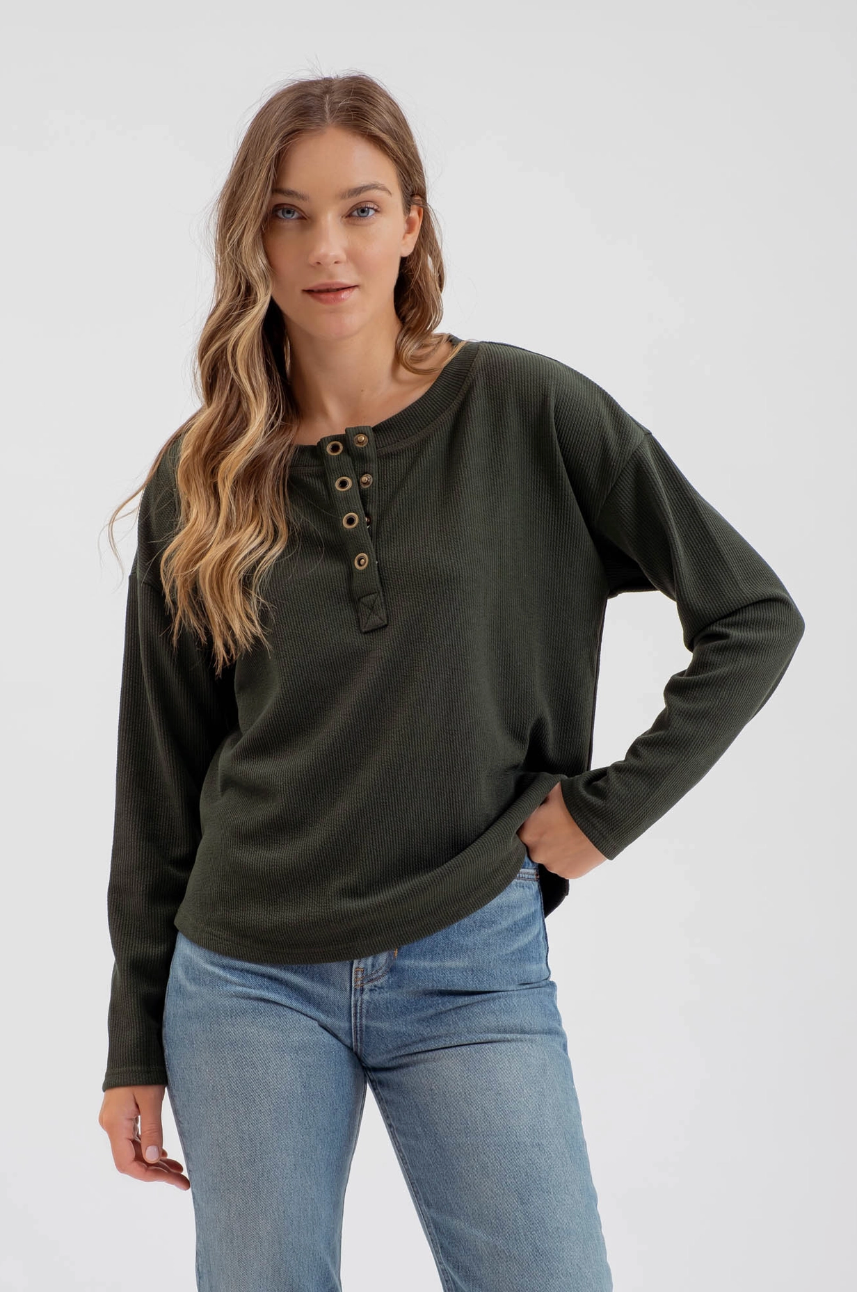 Half Button Down Long Sleeve Henley Knit Top - Hunter Green