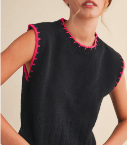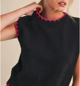 Blanket Stitch Pointelle Sweater Vest, Black Pink