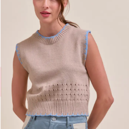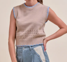 Blanket Stitch Pointelle Sweater Vest, Beige Blue
